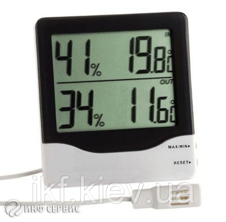 Цифровий термогігрометр для вимірювання внутрішньої й зовнішньої температури та вологості. Є функція Maxmin.